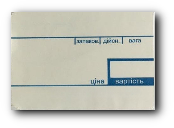 • У форму, розміщену на етикетці, наноситься назва продукту, ціна, термін придатності тощо.
